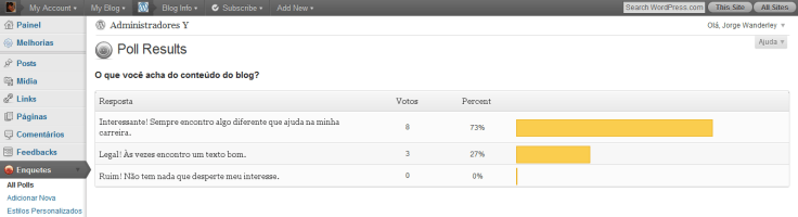 Outra informação que gostaria de compartilhar com vocês é o resultado da enquete que coloquei no blog há pouco mais de um mês. Houve poucas participações, mas mesmo assim as respostas foram positivas, 73% disseram que acham o Administradores Y interessante, e que sempre encontram algo diferente que ajuda na carreira. Confira na imagem a seguir (Clique na imagem para ampliá-la.).