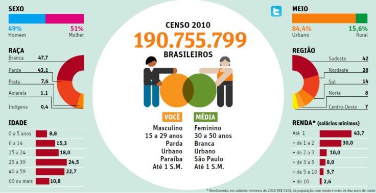 Ontem estava conferindo as notícias da Folha de São Paulo, quando vi um infográfico muito interessante falando sobre os resultados do Censo 2010. Uma das coisas que me chamou a atenção foi a forma como foi apresentado essas informações aos internautas, no qual antes conferir o resultado da pesquisa, você é convidado pelo sistema a preencher algumas informações para poder comparar os seus dados com a média brasileira. Muito interessante, não?